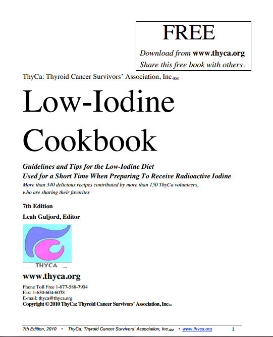 Low-Iodine Diet Guidelines — 1-Page Summary ThyCa: Thyroid Cancer Survivors’ Association, Inc. SM For details, & the ThyCa Free downloadable Low-Iodine Cookbook with over 420 delicious recipes, ... Retrieve Full Source
